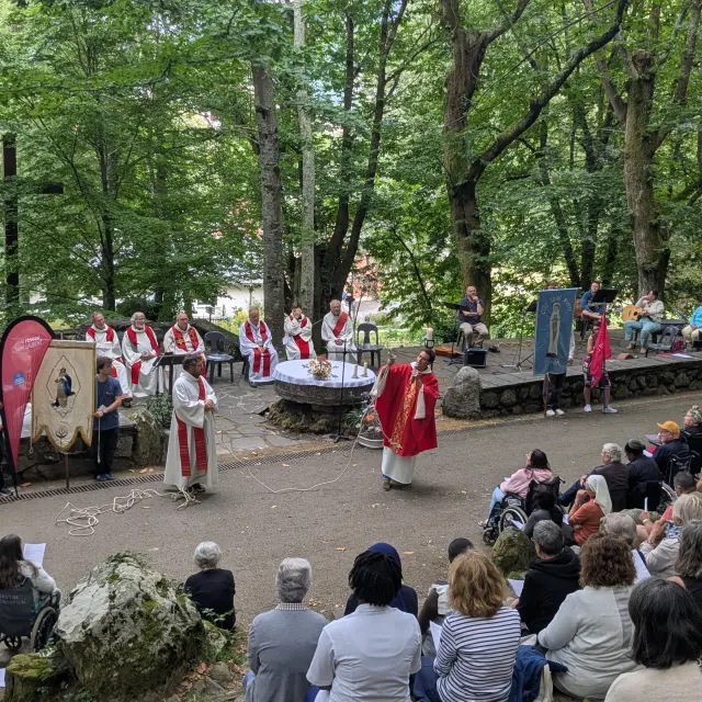 The surrounding nature envelops celebrants and pilgrims, fostering a deep sense of communion.